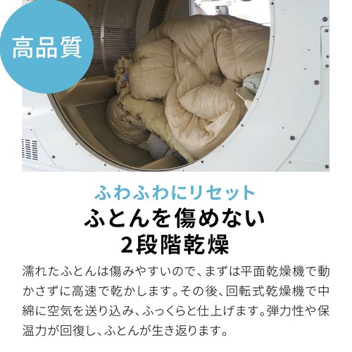 濡れたふとんは傷みやすいので、まずは平面乾燥機で動かさずに高速で乾かします。その後、回転式乾燥機(タンブラー)で中綿に空気を送り込み、ふっくらと仕上げます。弾力性や保温力が回復し、ふとんが生き返ります。